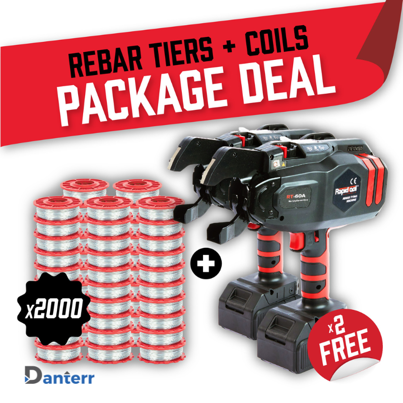 Product Description: The Package Deal is an unparalleled offer providing exceptional value in construction efficiency and savings. This exclusive package includes two premium RAPIDTOOL rebar tying machines, the RT-40A and RT-60A, at no extra cost with the purchase of 2000 discounted Tie Wire Coils. Designed for high-volume rebar tying tasks, this deal is engineered to enhance productivity and reduce manual labor significantly. With the inclusion of 4 high-capacity lithium-ion batteries, 2 single port chargers, tool belt clips, extra tie wire coils, and durable carry cases, this package sets a new standard in construction efficiency.